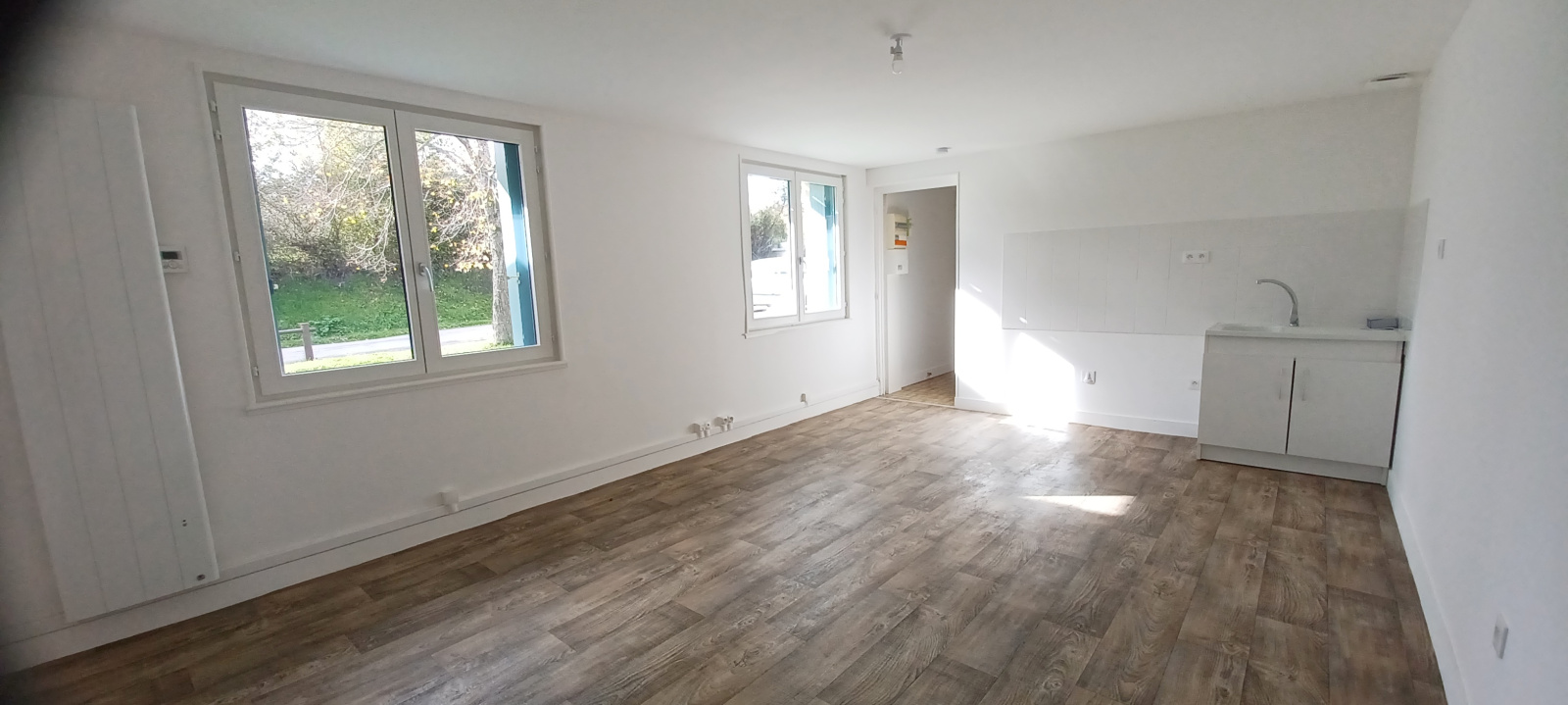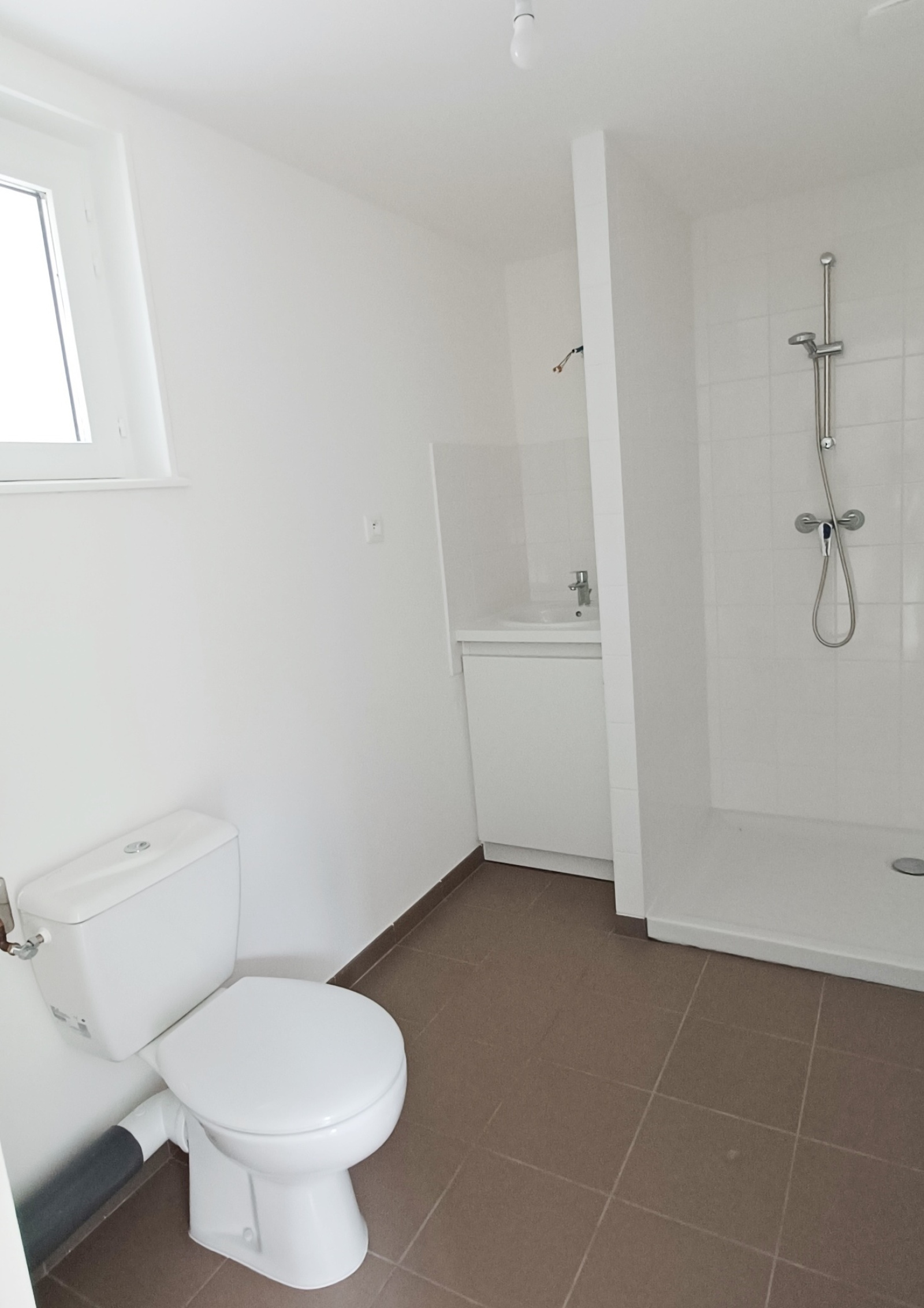 Petite entrée avec porte isolante, desservant une grande pièce de vie claire avec vue sur espace vert et une salle d'eau complète avec wc et fenêtre.