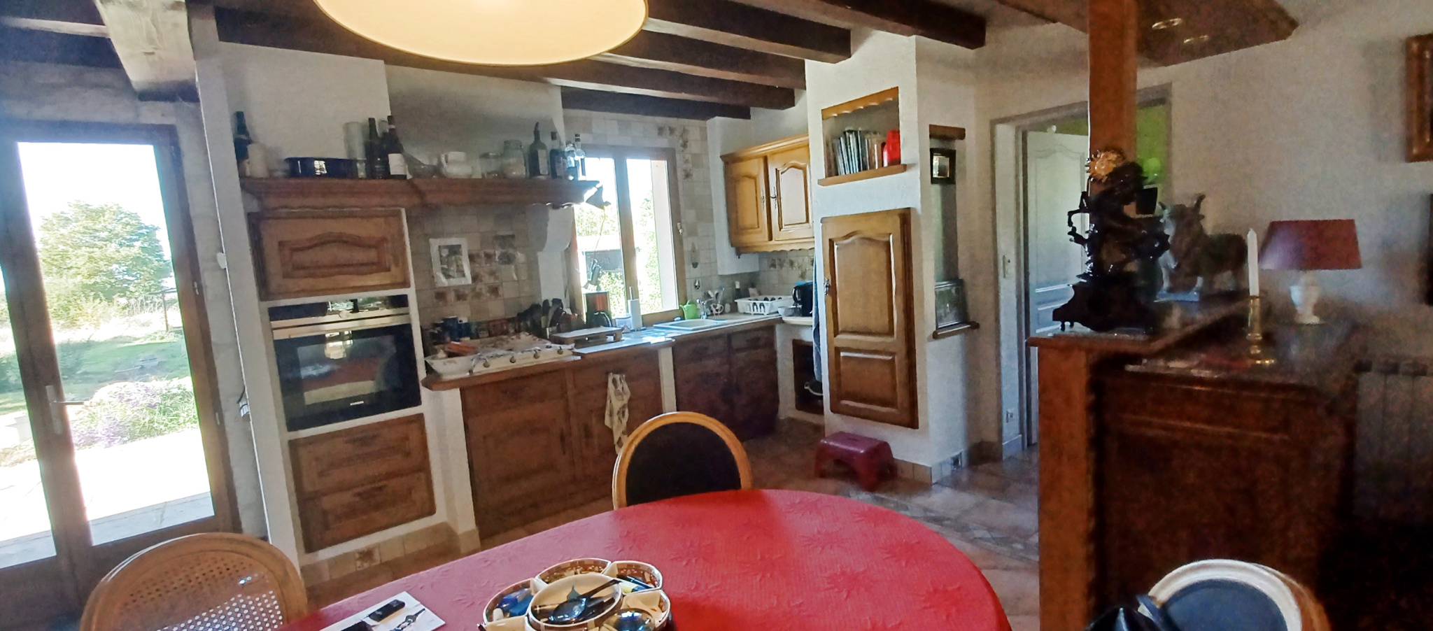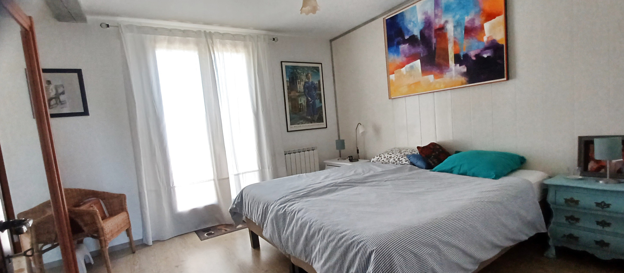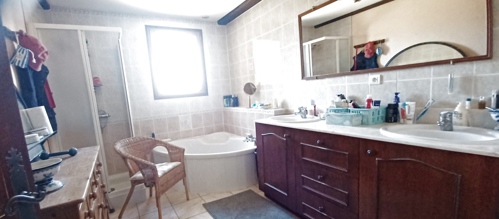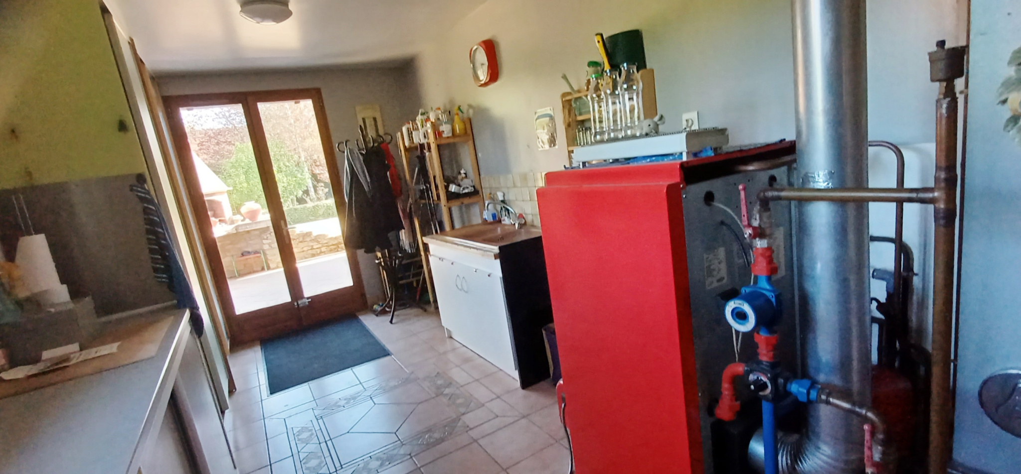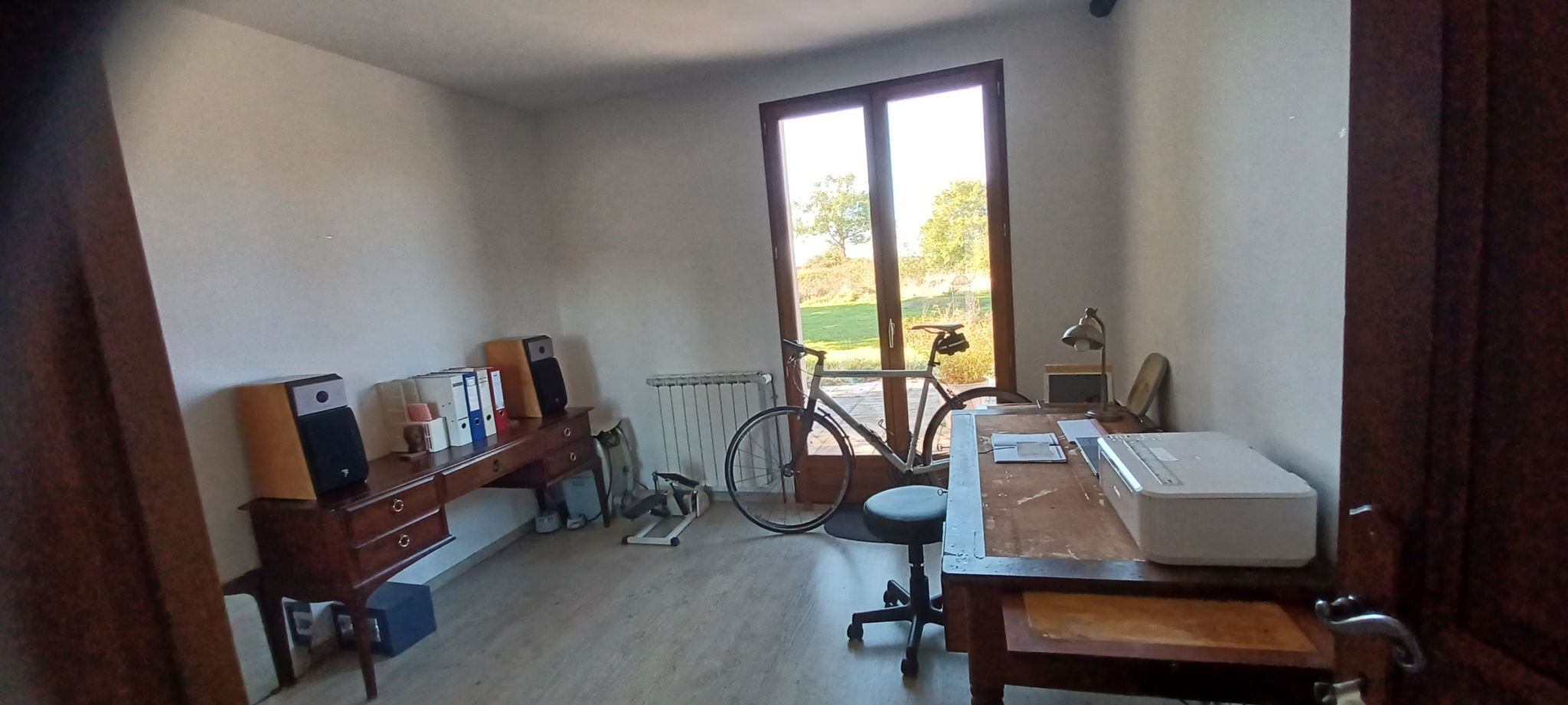 A l'étage le palier-bureau dessert 2 chambres dont une grande avec balcon et une pièce de rangement aménageable en chambre supplémentaire (avec arrivée d'eau pour sanitaires). Charpente traditionnelle. Poutres de chêne. Chauffage central fioul.