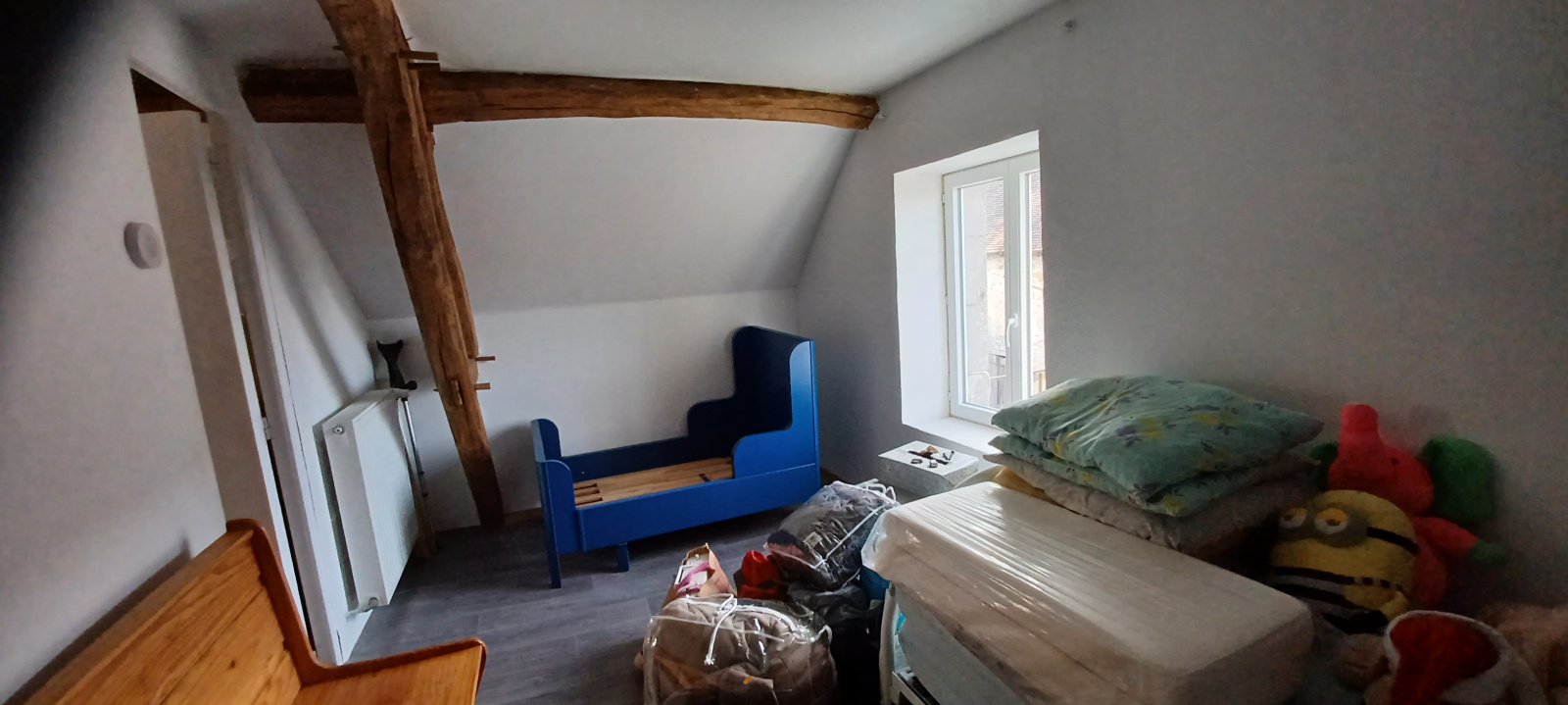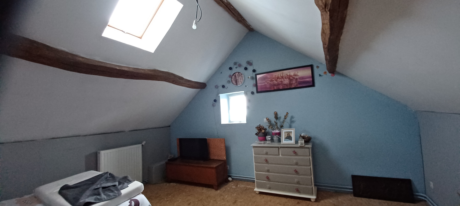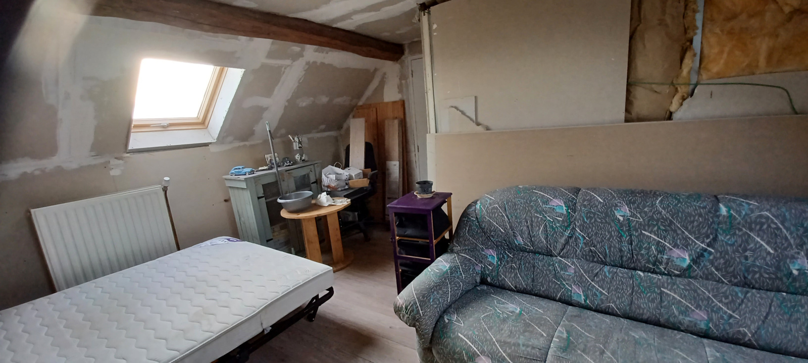 A l'étage 3 chambres en sous pente à terminer à son goût. Chauffage central Pompe à chaleur AIR/EAU et poële à bois (DPE classe C). Double vitrage.