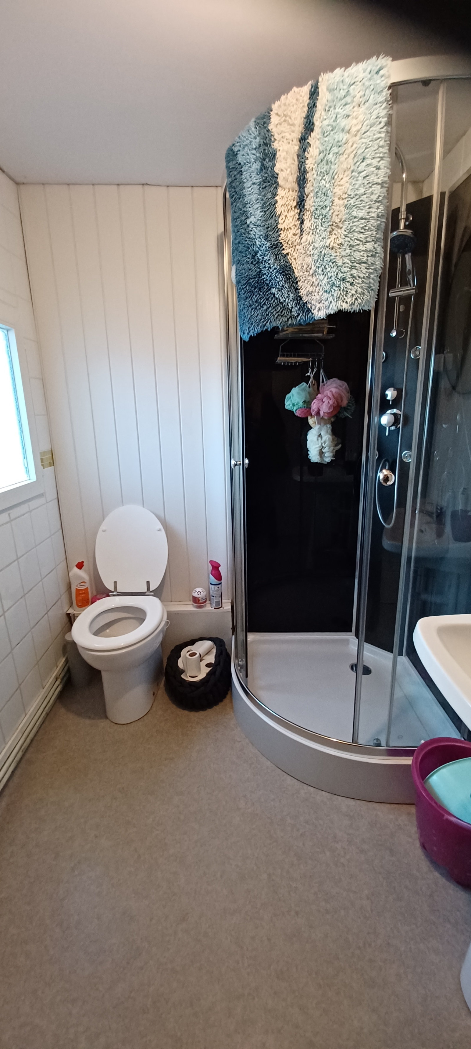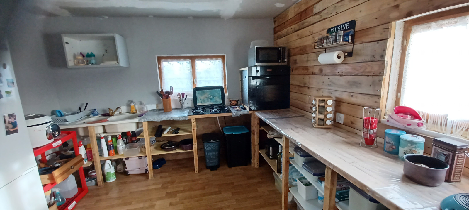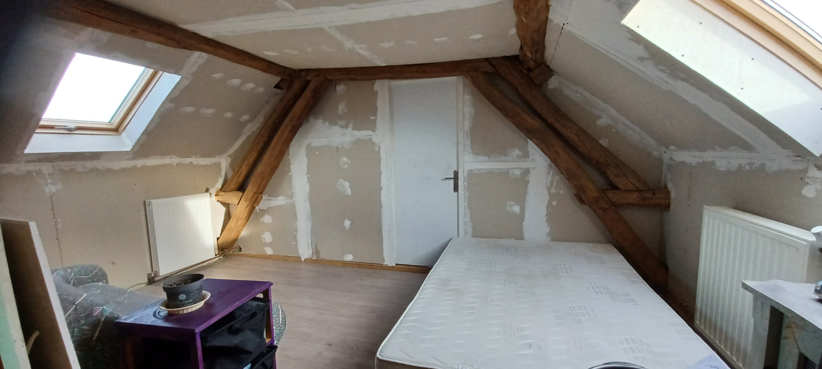 A l'étage 3 chambres en sous pente à terminer à son goût. Chauffage central Pompe à chaleur AIR/EAU et poële à bois (DPE classe C). Double vitrage.