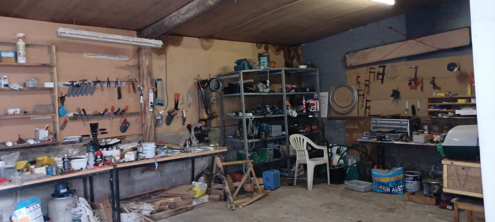 Grange en bon état à usage de garage et remise. Hangar-atelier, couverture bac acier. Bassin hors sol diam. 3.60m avec pompe et bâche hivernage.