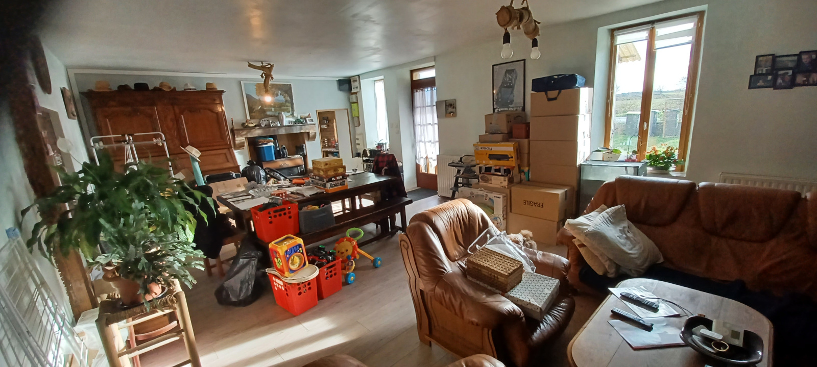Ancienne ferme Plain-pied : grand salon-séjour ouverture SUD sur cour, cuisine et chaufferie-buanderie attenante, salle d'eau avec wc, chambre.
